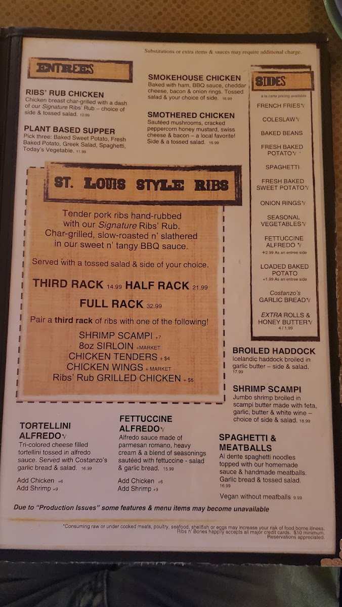 At Ribs N' Bones Menu, every dish tells a story of flavor, warmth, and comfort. Located in the heart of Warren, PA, at 6452 Jackson Run Rd, this cozy spot is the perfect destination for meat lovers craving a hearty meal. Whether you're here for their tender, slow-cooked ribs, perfectly seasoned sides, or mouthwatering bone-in favorites, there's something to satisfy every taste. From smoky barbeque perfection to bold, savory seasonings, each bite offers a delightful experience that keeps you coming back for more. The menu boasts a wide variety of options, ensuring everyone finds their ideal dish to indulge in. The relaxed atmosphere invites you to sit back, relax, and enjoy every moment with friends and family while savoring the rich flavors that make Ribs N' Bones a must-visit.