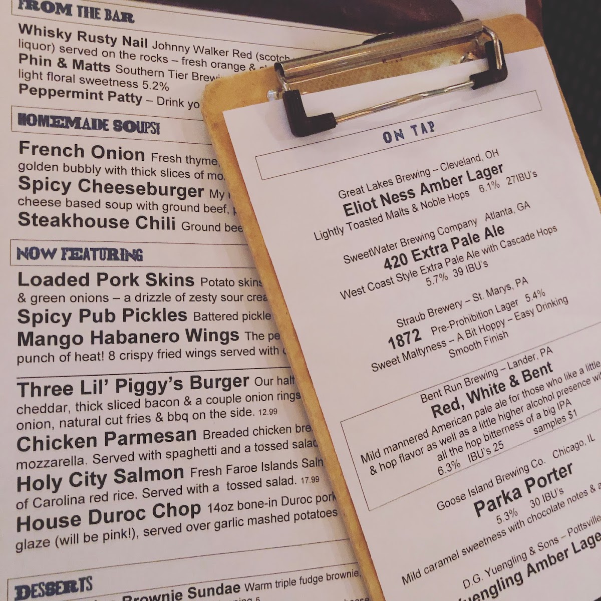 Cheddar, onion straws, pickles, brioche bun, LTO. Pub fries or Ribs' Rub chips.